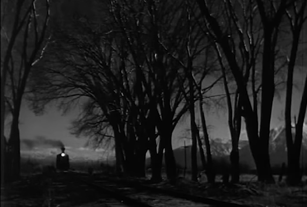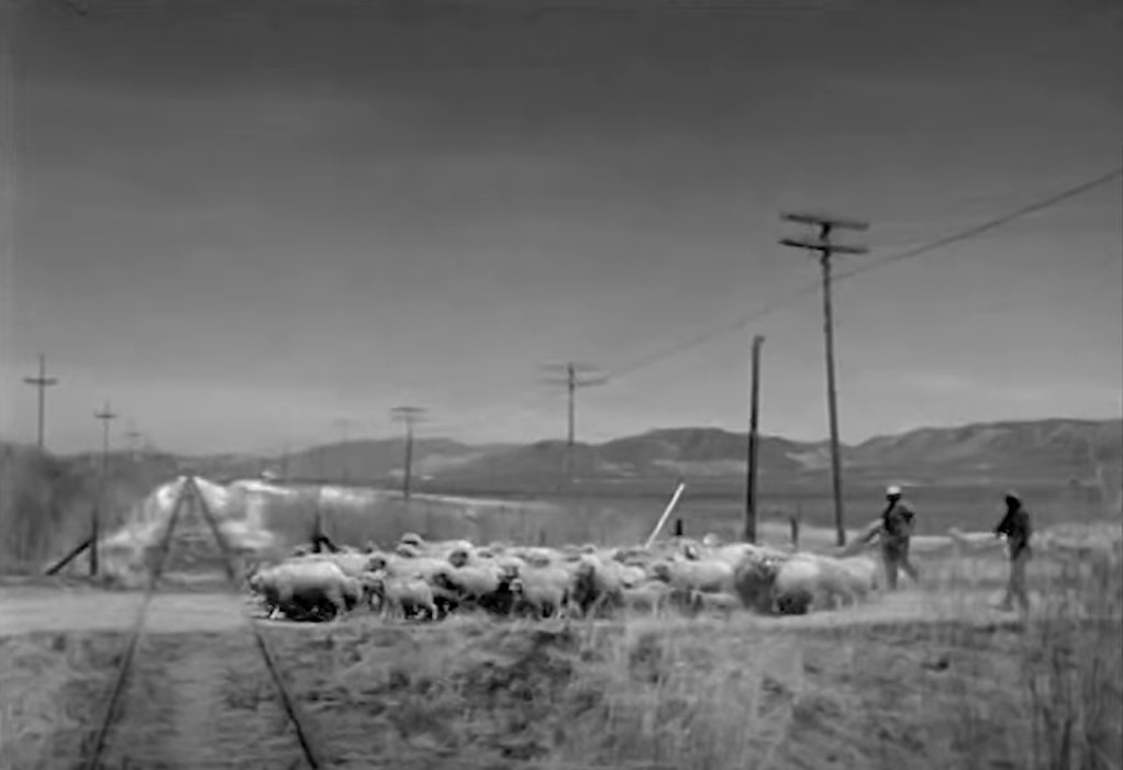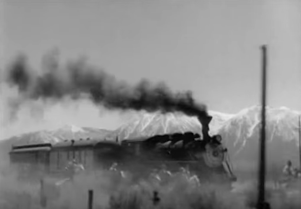 V&T 2-8-0 #5 leads mail-baggage #23 and combination car #18 in an establishing shot that will be seen repeatedly throughout our feature. Judging from the snow-capped mountains and arrow-straight track, (and a quick peek at one of my Larry Jensen books), I believe the location to be somewhere between Carson City and Minden, Nevada. Lots of pacing shots, so there’s undoubtedly a paved road paralleling the railroad.