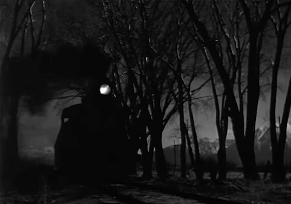 A little “day for night” filming technique finds our consist trundling through a grove of trees. Turn on the headlight!