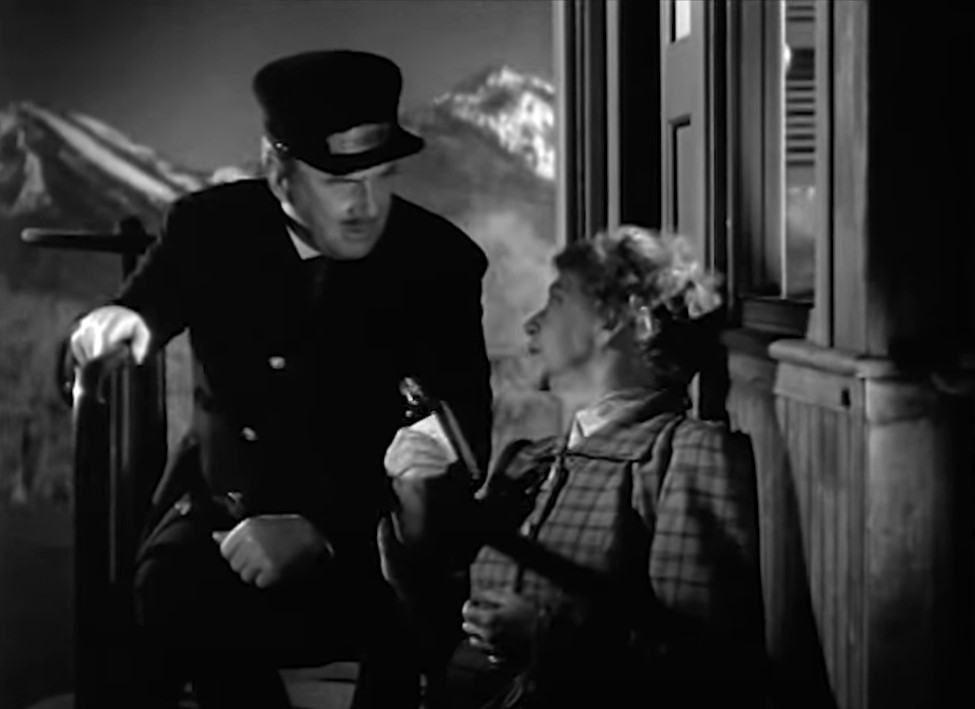 Auntie has good reason to fortify herself. A fugitive from justice is riding up behind the train, boarding the rear platform to make his escape. Uh-oh. It looks like he’s been a naughty boy. Naturally, Invalid Gal takes a shine to him.