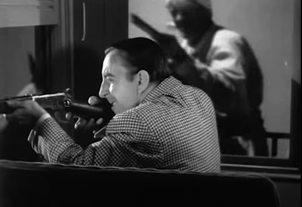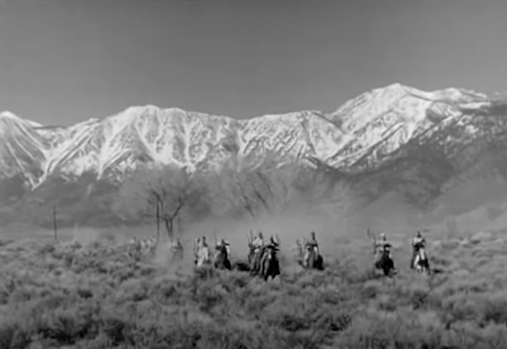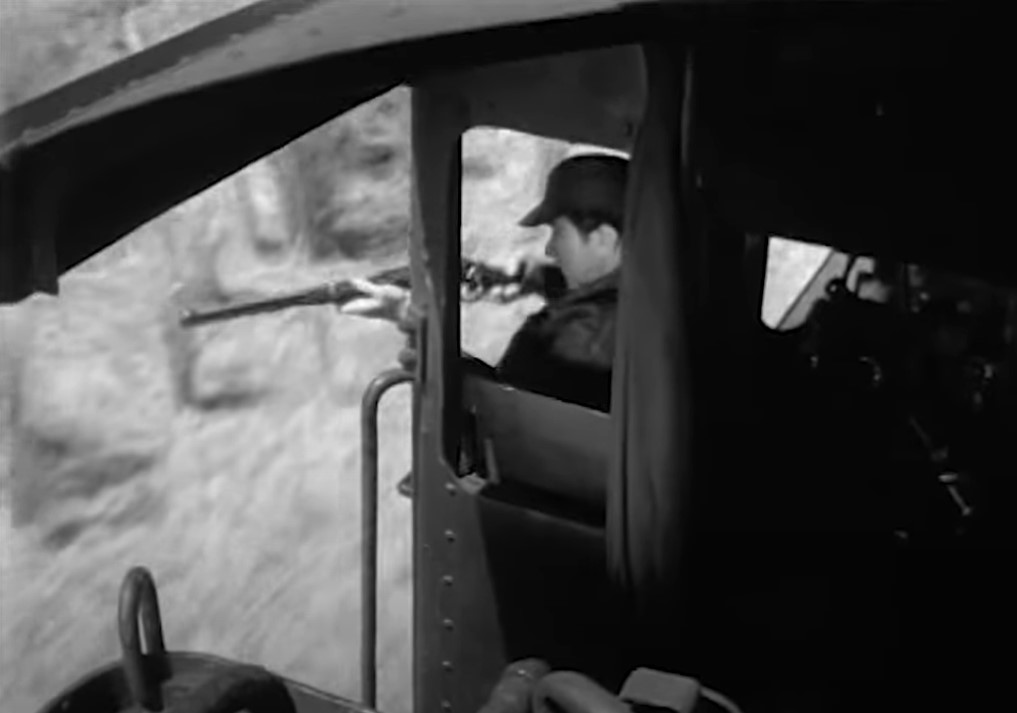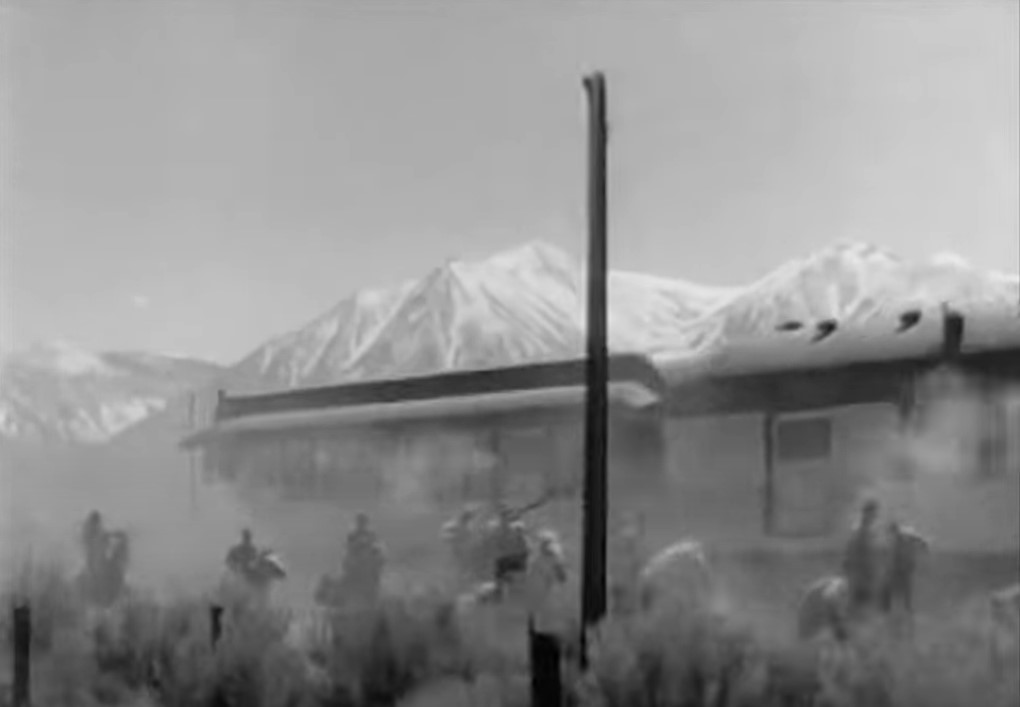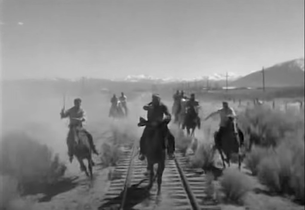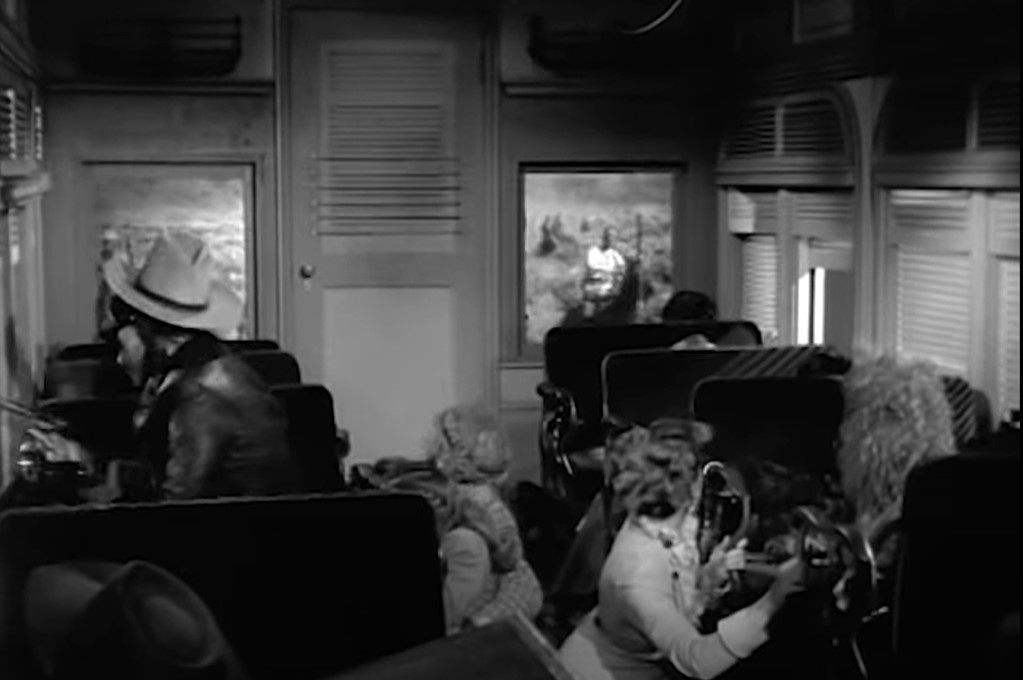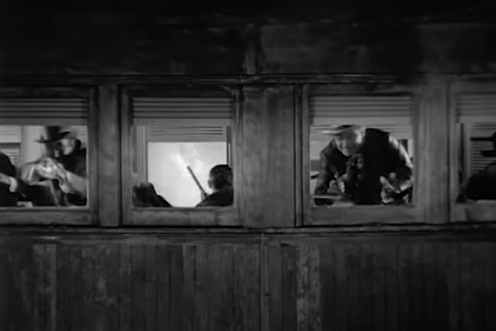 Rifles are passed out and the passengers take pot shots at the back-screen-projected stuntmen. Who woulda thought a corset salesman was so handy with a rifle?