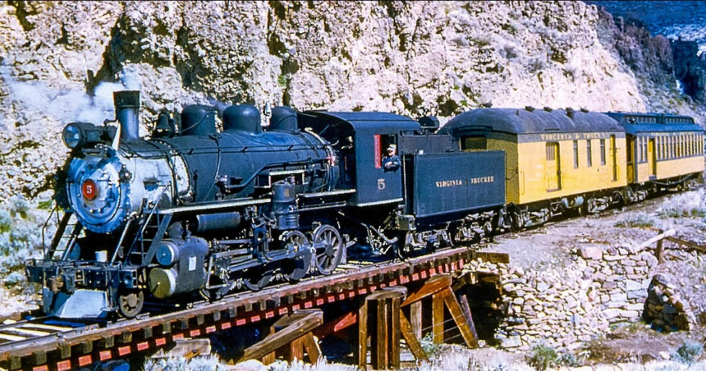 The above vertical picture comes from the Western Nevada Historic Photo Collection and I quote from their link: “The engine crew poses with Virginia and Truckee locomotive #5. This was the last engine purchased by the railroad. It was scrapped soon after the railroad ceased operation. By November 1950 the railroad was out of business, and the crew was running the locomotive to bring the last remaining equipment out of Carson City to Reno for sale or scrapping.”