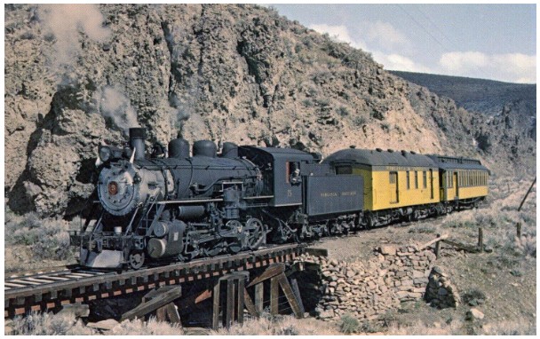 Don’t let the title fool you. The star attraction is a Virginia & Truckee steam locomotive and two car passenger train filmed in Nevada in that road’s last days of operation. I was able to find several color pictures of this movie train as well as extensive details about the engine.