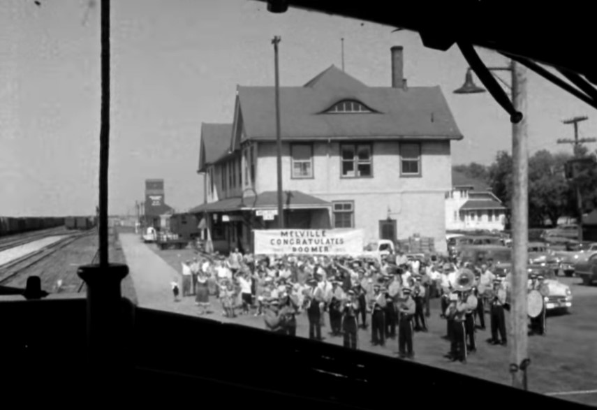 Here they are pulling into the Melville, SK station. Wow, what a crowd on hand to greet Boomer! Why there’s even a brass band for a couple rousing verses of “I’ve been working on the railroad” and “For he’s a jolly, good fellow”.
