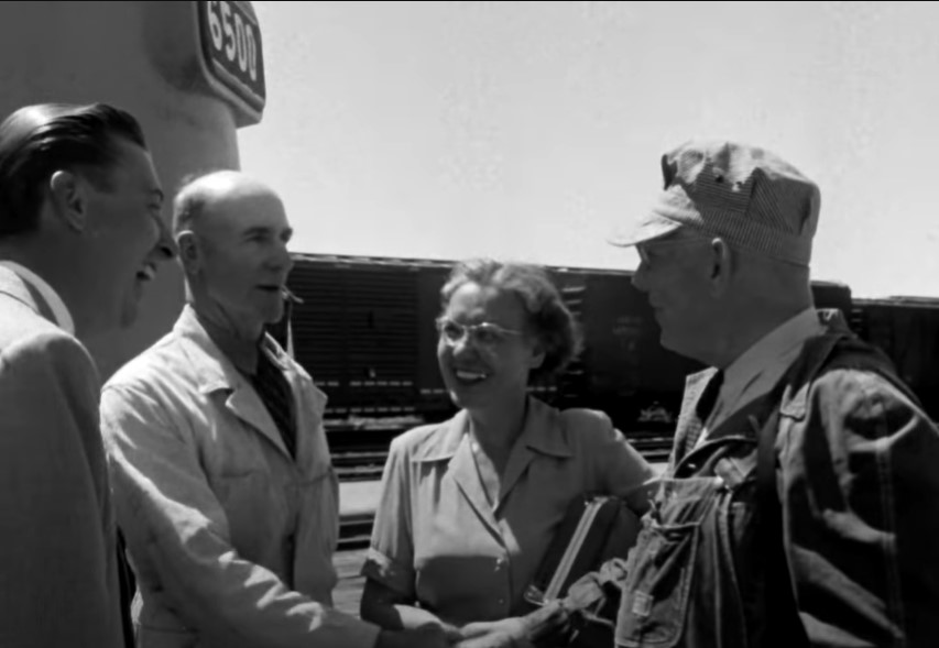 It’s smiles and handshakes all around as co-workers (and Mrs. Cardwell) congratulate Boomer on his retirement. In the background, #3 slides west out of the depot.