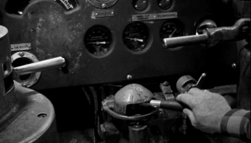 3rd cab ride. Fred now finds himself near the controls of CN #9060, a GMD F7A freight unit built in 1951. The hostler shows him around. “This is the throttle”, “This is the Independent (engine) brake” and “This is the Automatic (train) brake”.