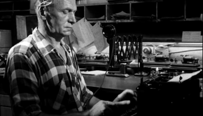 Inside the station, the agent is typing out train orders telephoned in from the dispatcher.