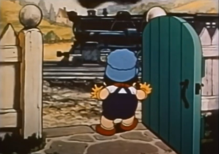 Like most small boys of the era, Phil dreams of operating a steam locomotive and, of course, blowing the whistle. Hearing an approaching train, he sneaks by Boots to watch, but his canine companion is keeping an eye on him.