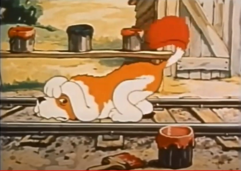 More powerful than a locomotive! The frantic canine finally gets loose and outruns the speeding 4-6-2, then attempts to flag the train with a conveniently-placed can of red paint.