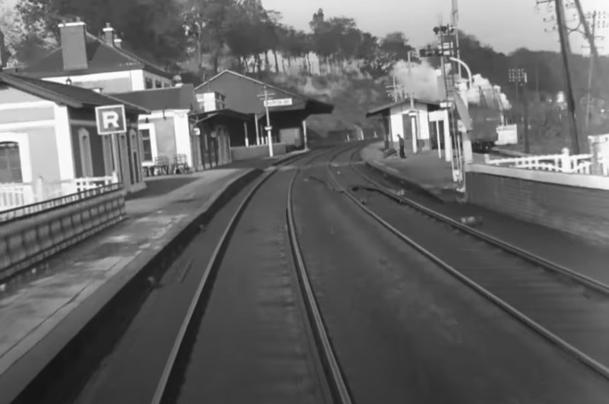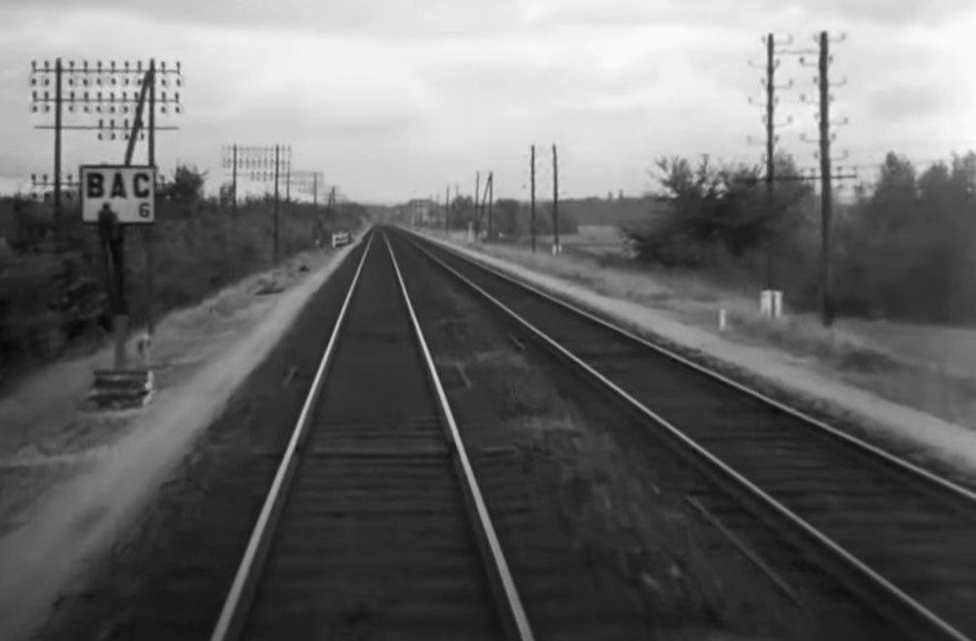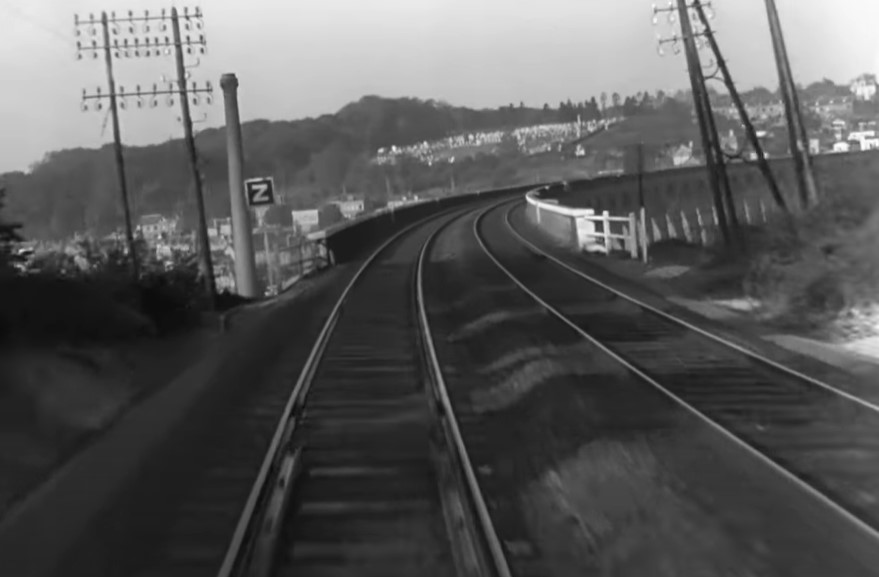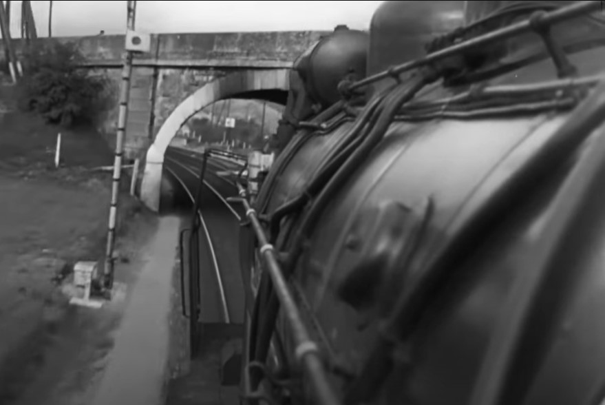 Engineer’s view of a meet with an opposing express train; look at those close clearances as they come upon an overhead arched bridge!