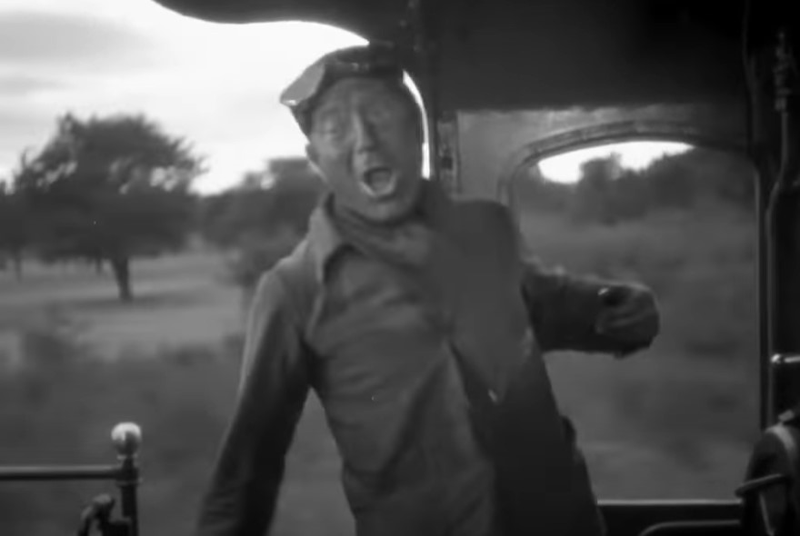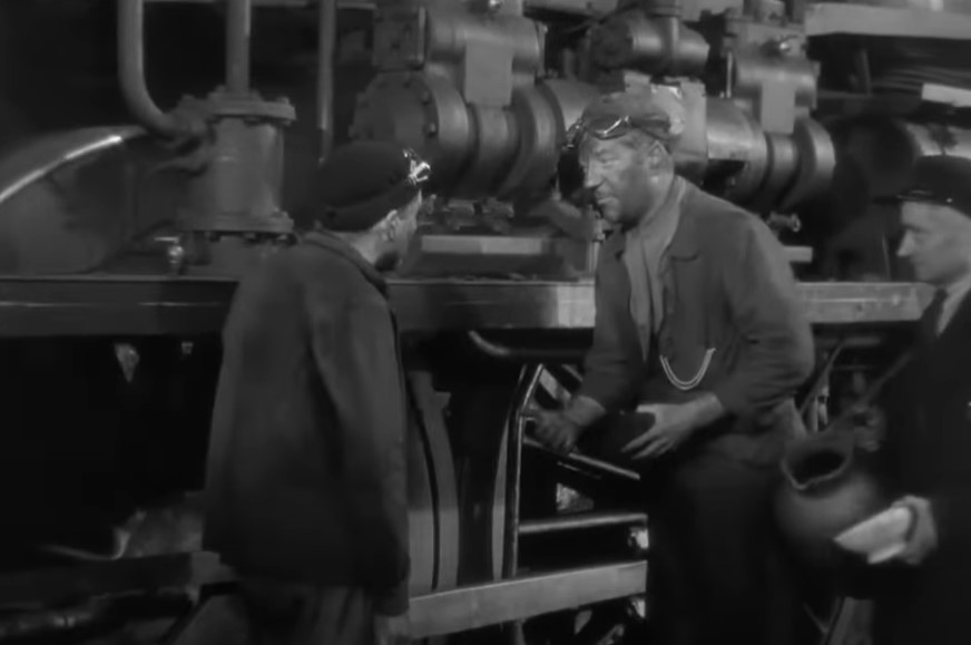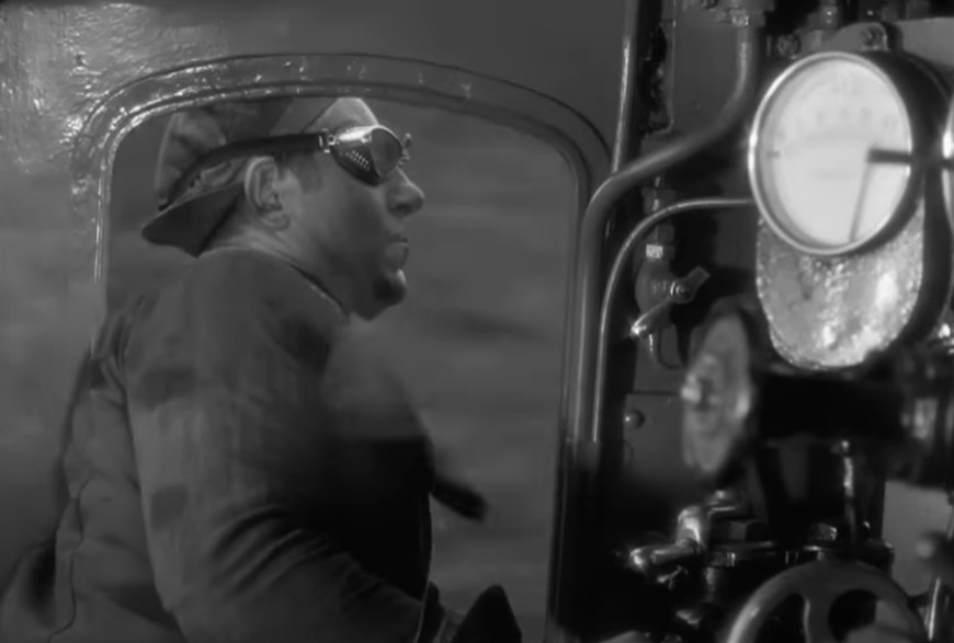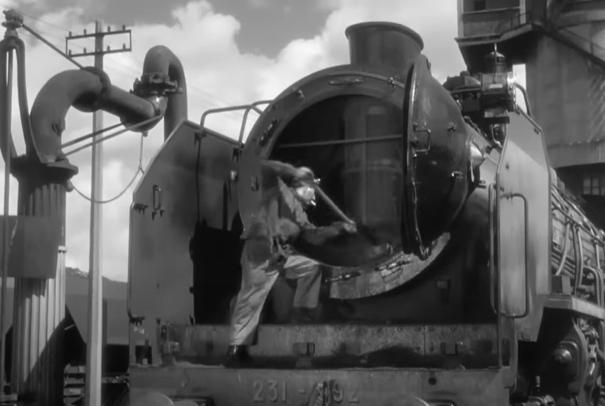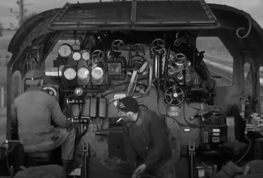 Jacques whistles for his fireman Pecqueux (played by Julien Carette). I’m guessing that’s engine cab shorthand for “needs a drink of water”. Pecqueux turns a valve wheel on the backhead to inject some water.