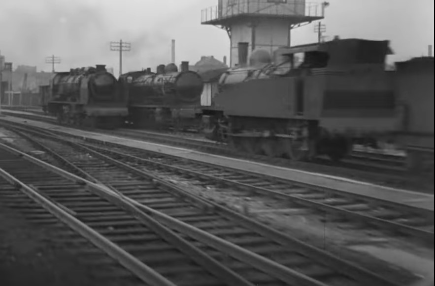 As they pull into Le Havre station, we see quite the variety of steam power outside the terminal. How about that Tank Engine Thomas clone under the yard tower?