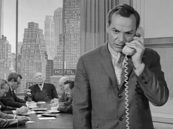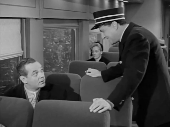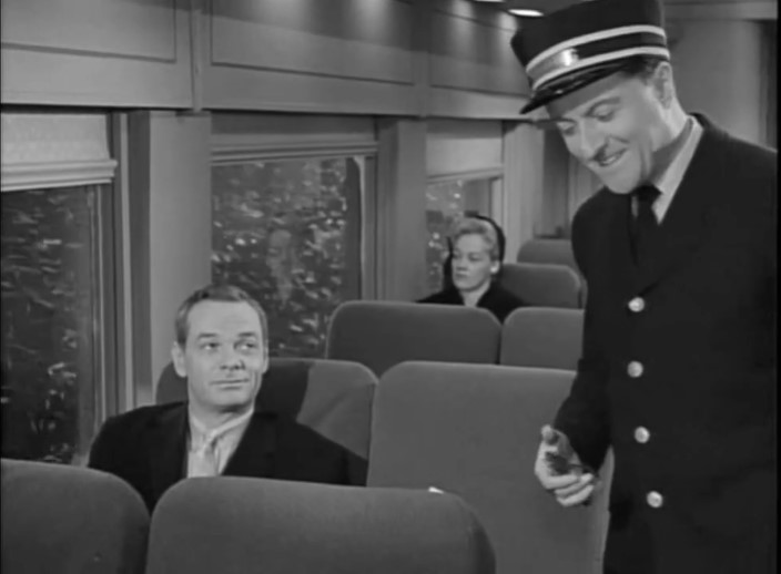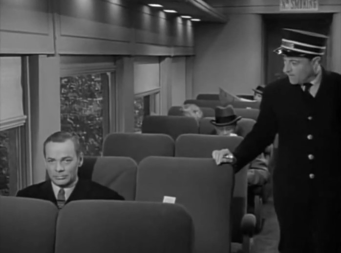 Where was I? Oh, yes. Our first train scene happens at the 6:00 minute mark. After a really rotten day, Mr. Williams heads home on the New Haven Railroad commuter train, snow flying outside. Gart puts on a brave face as the 1960 conductor (played by Jason Wingreen) chats him up.