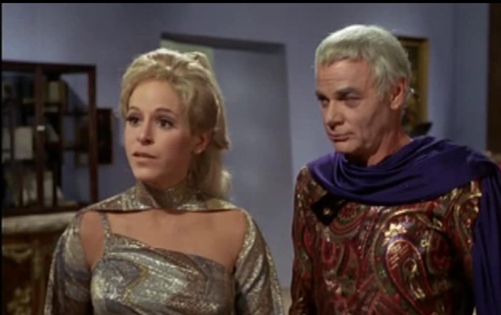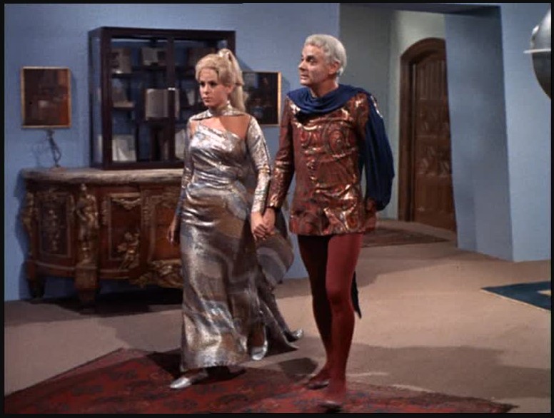 Just look at that snazzy arm candy Flint/Gart is squiring around. It’s Robotic Rayna Kapec (played by Louise Sorel) ROWF! Zowie!! Schwing!!!, Flint’s “ward” (yeah, right) who eventually catches the lecherous eye of Captain Kirk!