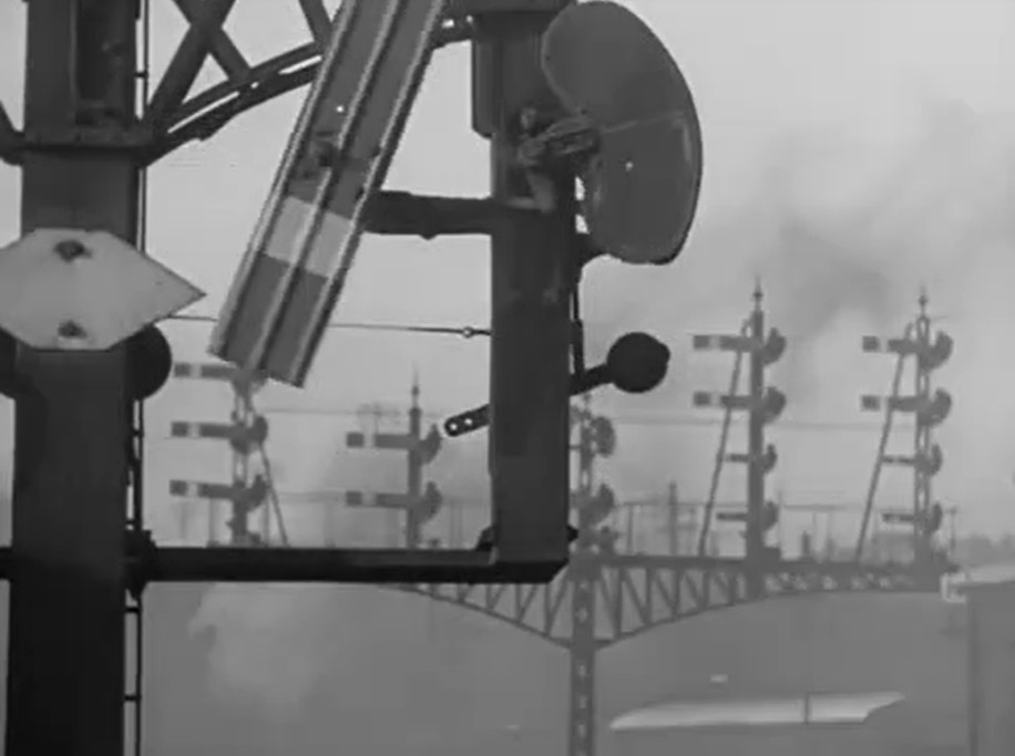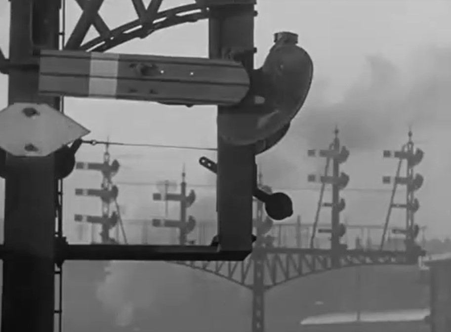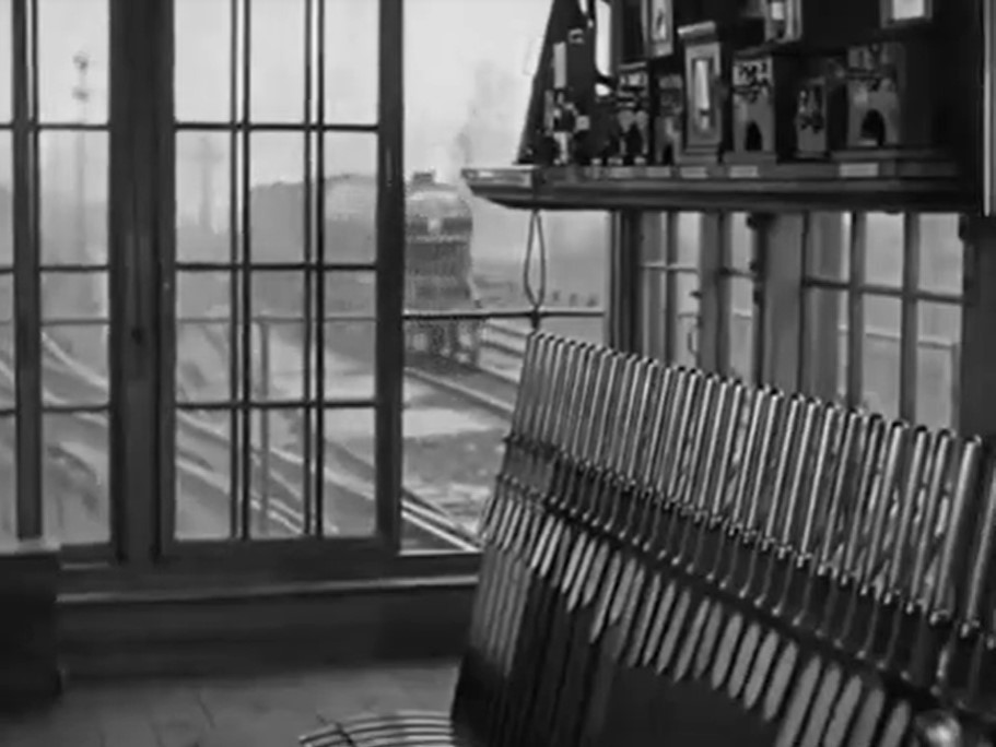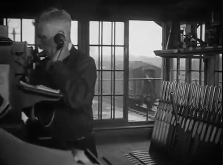 Great pair of shots as first Flying Scotsman, then her consist rumble past an interlocking tower (I think the British call them signal boxes). The towerman calls headquarters to report this anomaly.