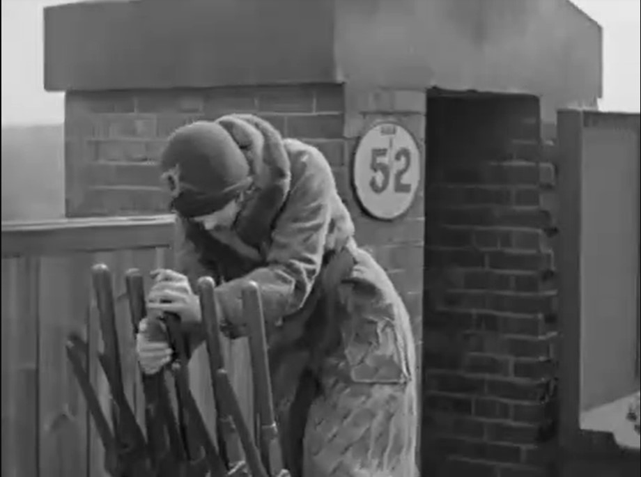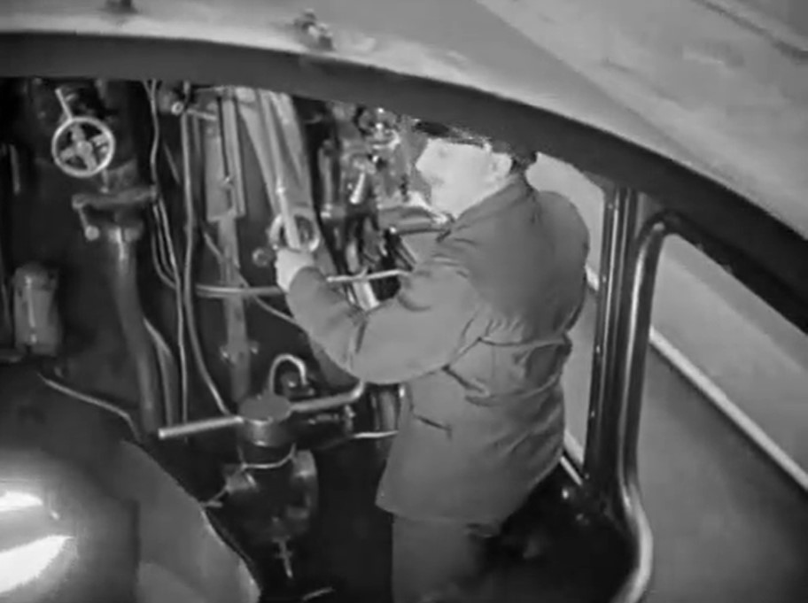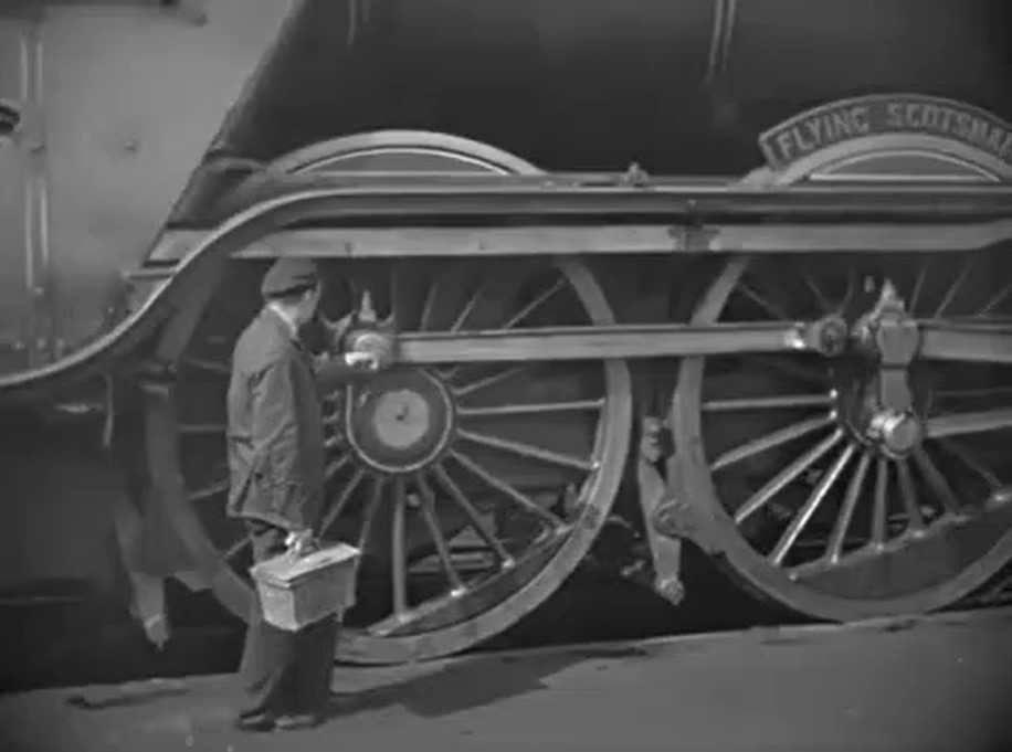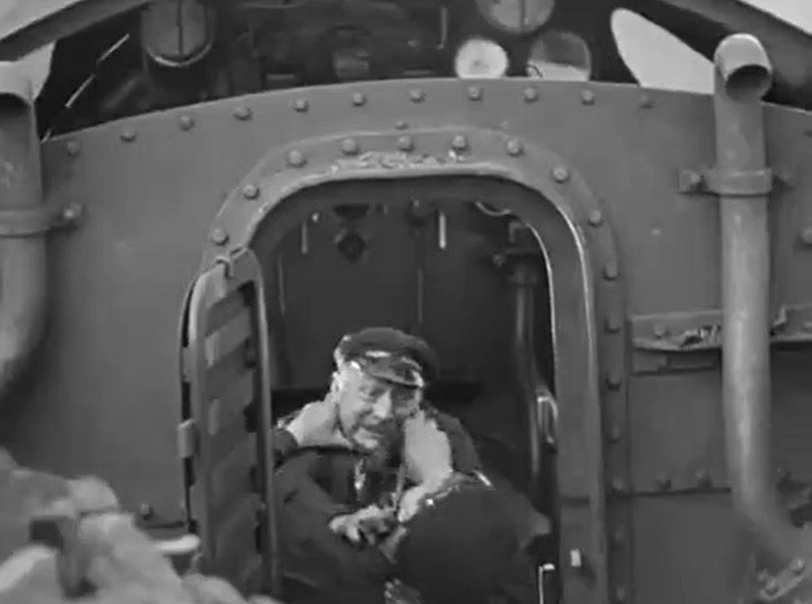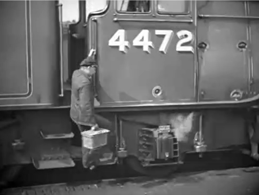 Engineer Bob and Fireman Jim sign in for the run to Edinburgh. Later, they approach 4472 with armfuls of lanterns and classification lamps.