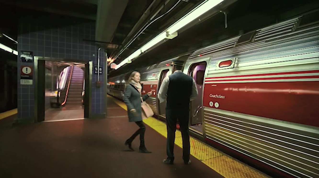 Filmmakers splurged on a simple red “wrap” to cover up the Amtrak logos and blue sides of several Amfleet coaches and food service car. Track 5 has a sign pointing to New Jersey.