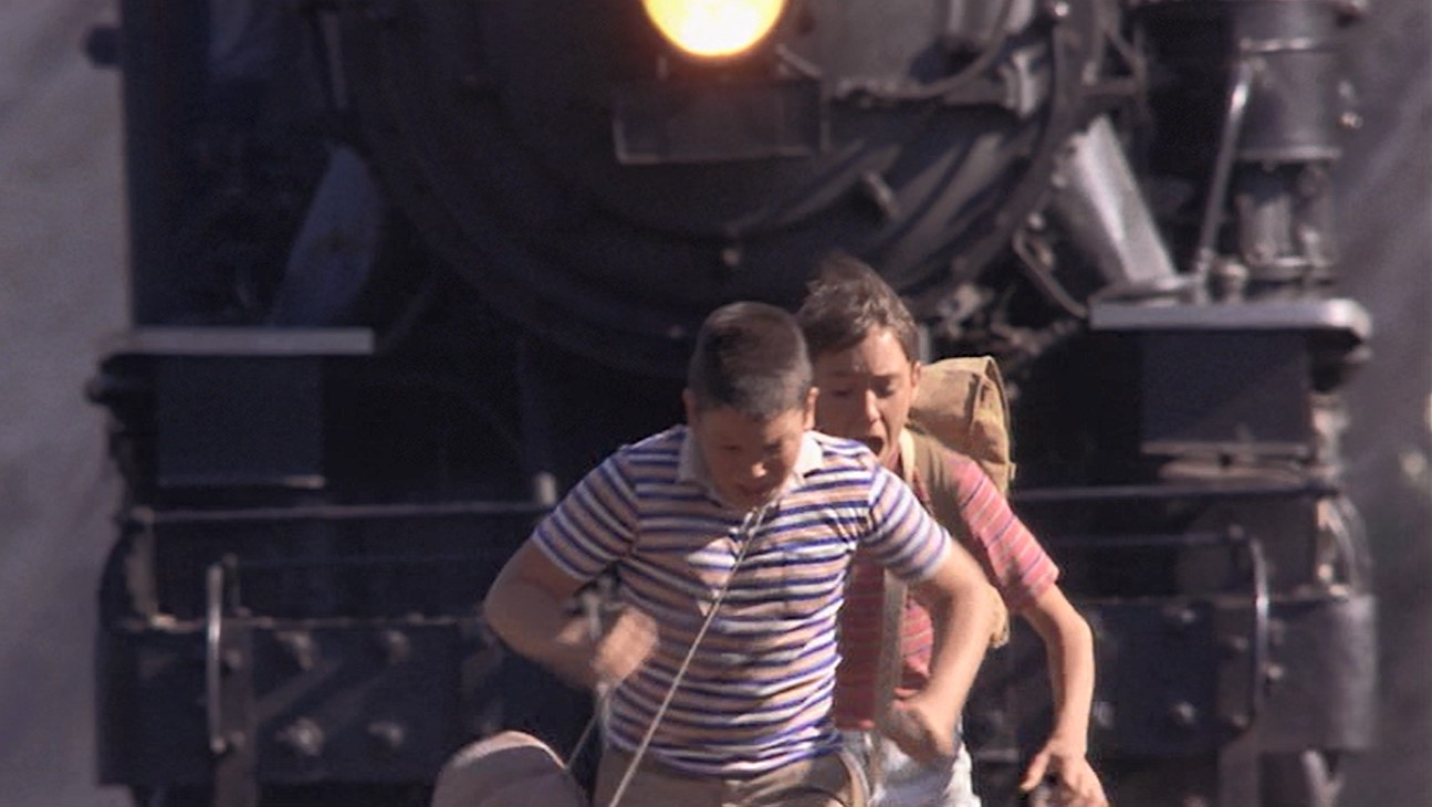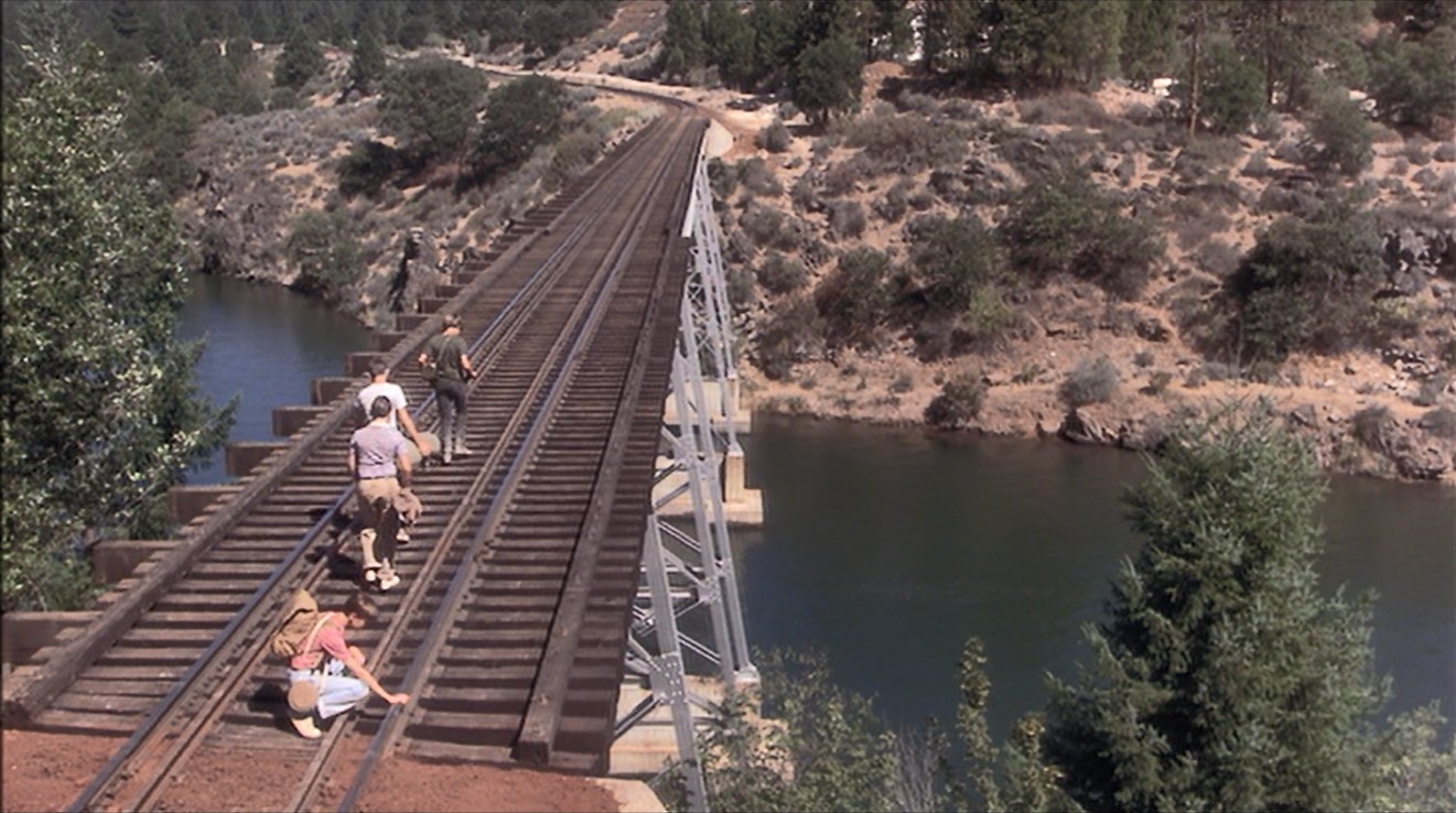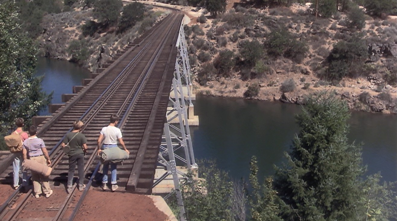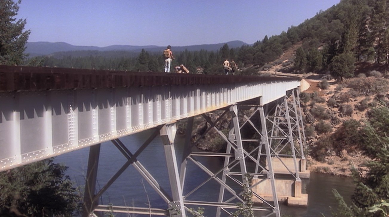 The BIG bridge and most famous scene from the film. Gordie (Wil) puts his hand on the rail to FEEL any train coming. Doesn’t work. Side view of the boys crossing the trestle. Hey, Vern (Jerry), you’re NEVER going to get across that way…