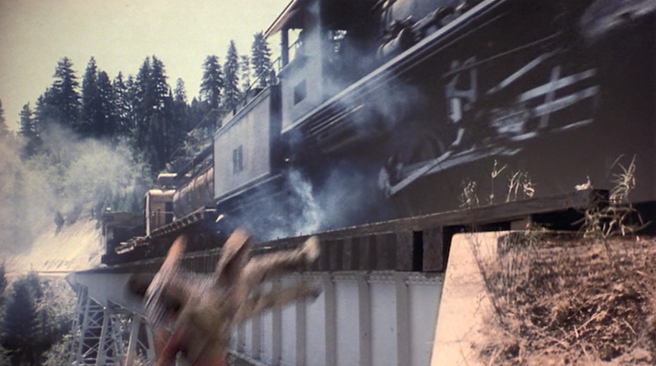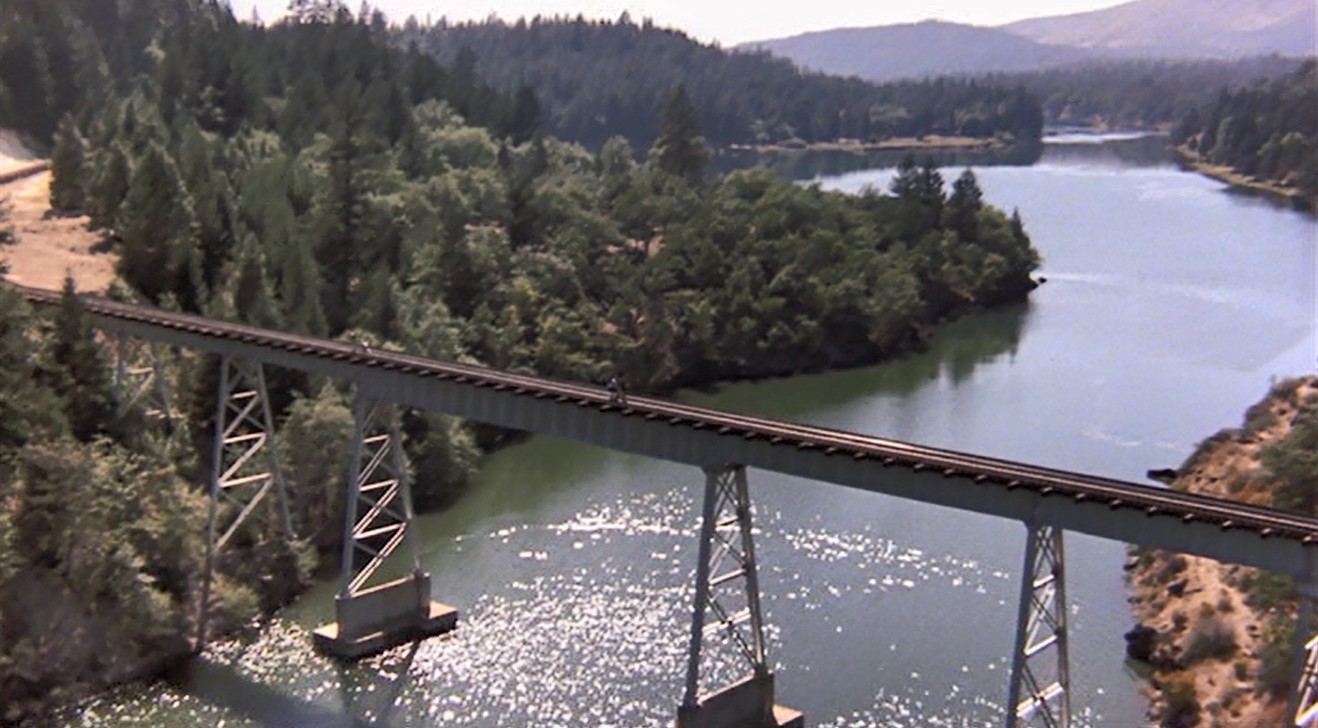 Beautiful down-on shot of the bridge. Uh-oh. Smoke through the woods. Traaaaaaaain!!