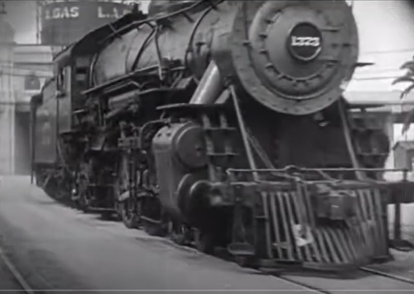 Meanwhile, a short passenger train enters the Los Angeles station. It’s ATSF #1373 leading a heavyweight baggage car and coaches. That’s the First Street Viaduct in the background.