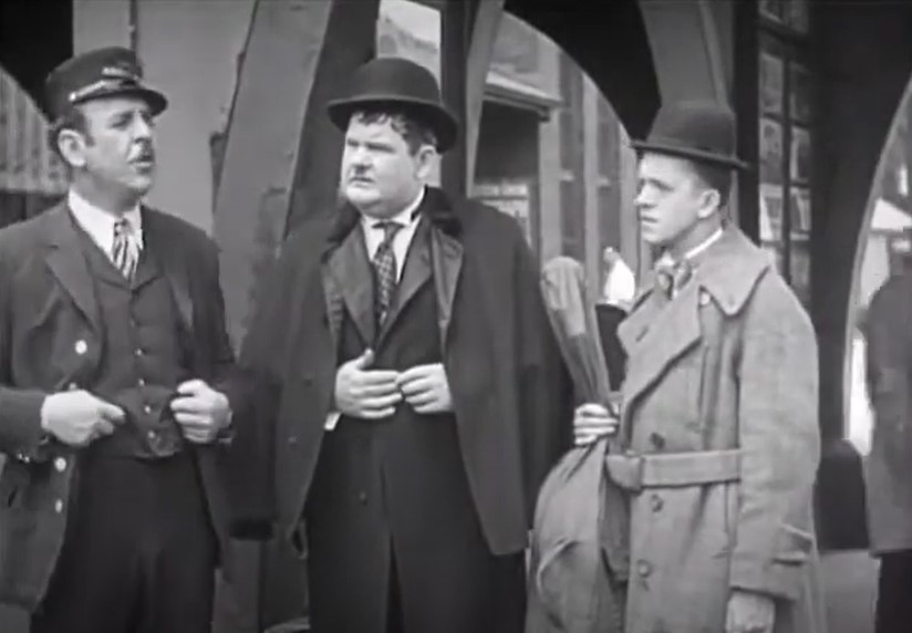 Ollie urges Stan to hurry, as he stands on the step box; Since the train has moved forward, Oliver does a spectacular pratfall; Stan finally arrives, but only makes the situation worse, with papers flying everywhere.