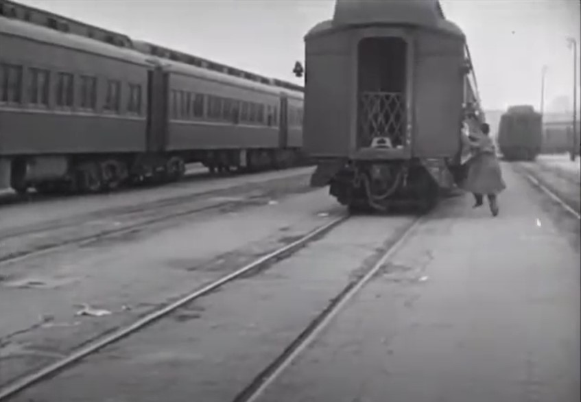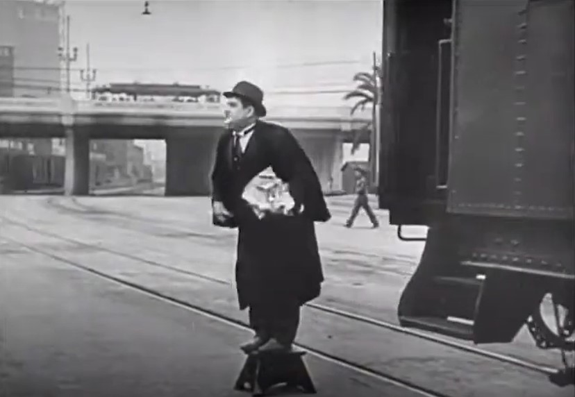 Abandoning everything except Stan’s bass fiddle, the two thespians make a last, desperate attempt to catch their train. Note the step box in the rear vestibule and the passengers waving goodbye. Nice string of heavyweight passenger cars on the depot tracks.