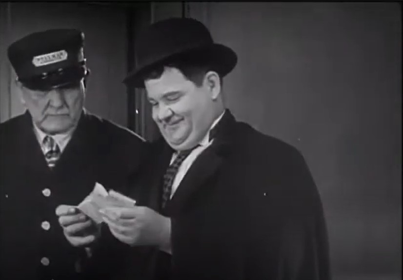 The rub is, the Conductor is speaking gibberish in a loud voice, confounding Stan & Ollie.
