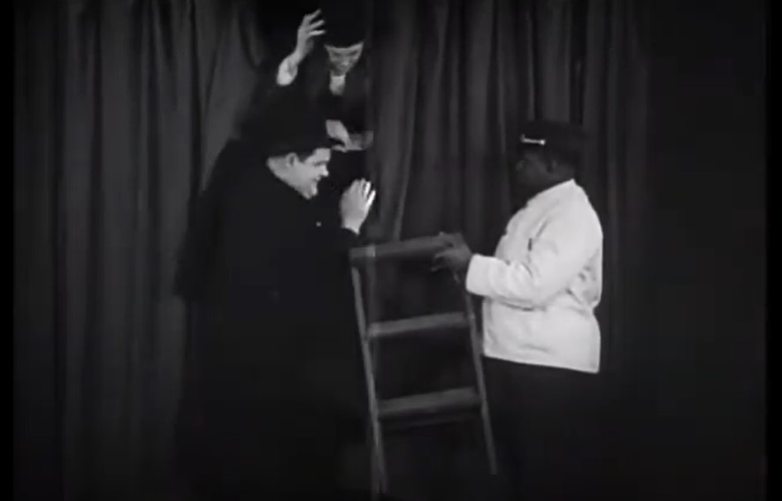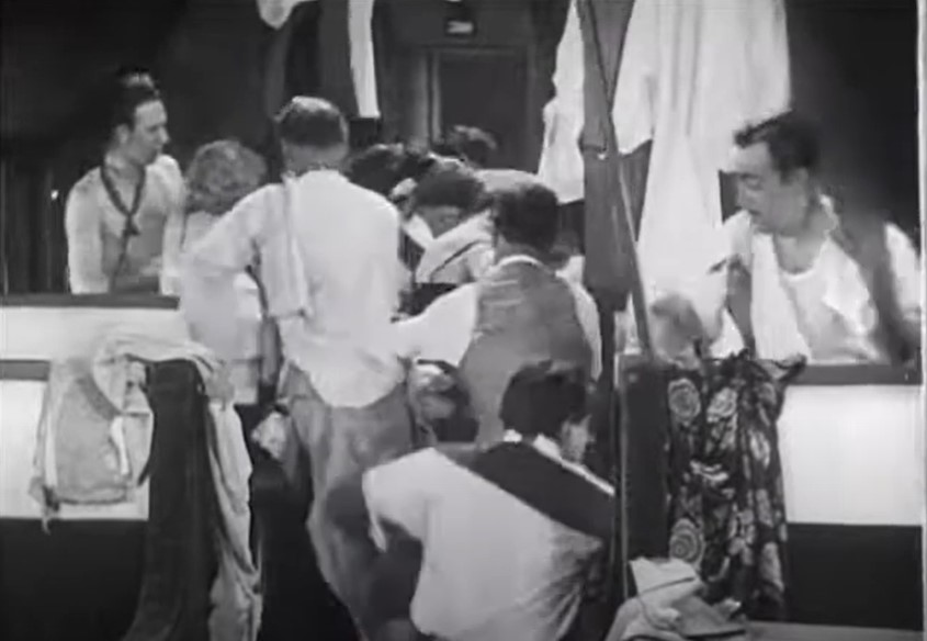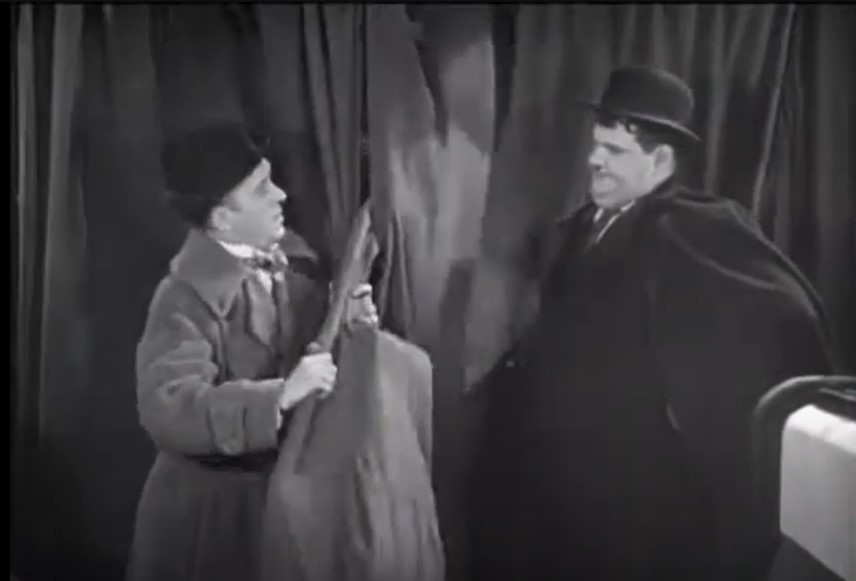 Reaching their assigned berths, there’s the problem of how to get into the upper. Interlocking fingers doesn’t work. Neither does standing on Hardy’s back (Laurel takes his time removing his coat). At last, the porter happens by with a ladder (which is the way it was done on actual Pullman cars).