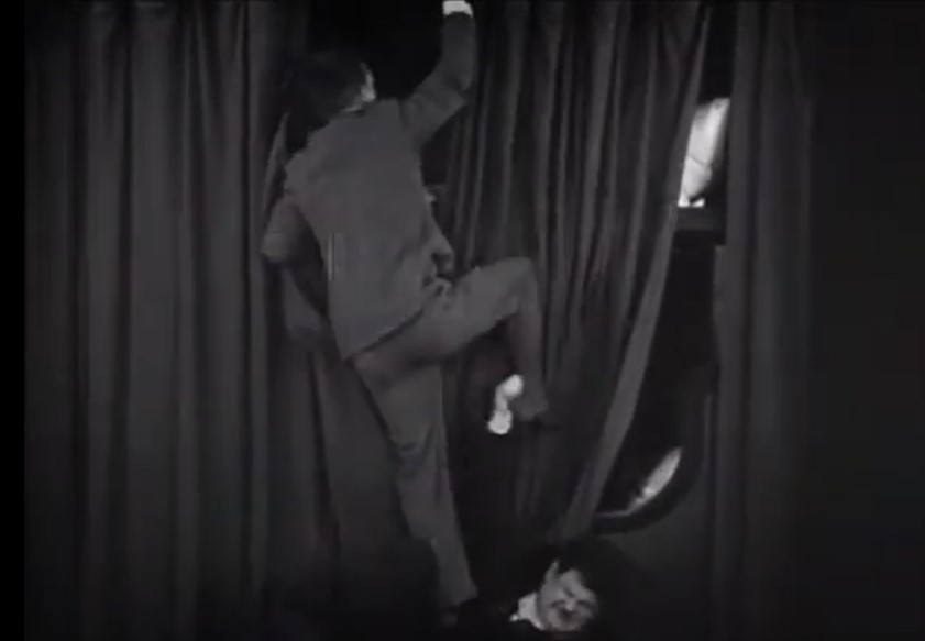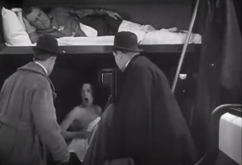The Pullman Conductor lifts their ticket and sends them into the next car (configured with upper and lower berths with curtains for privacy). Stan manages to pull down a set of curtains with his bulky instrument, prompting a shrill scream from the scantily-clad girl in the lower.