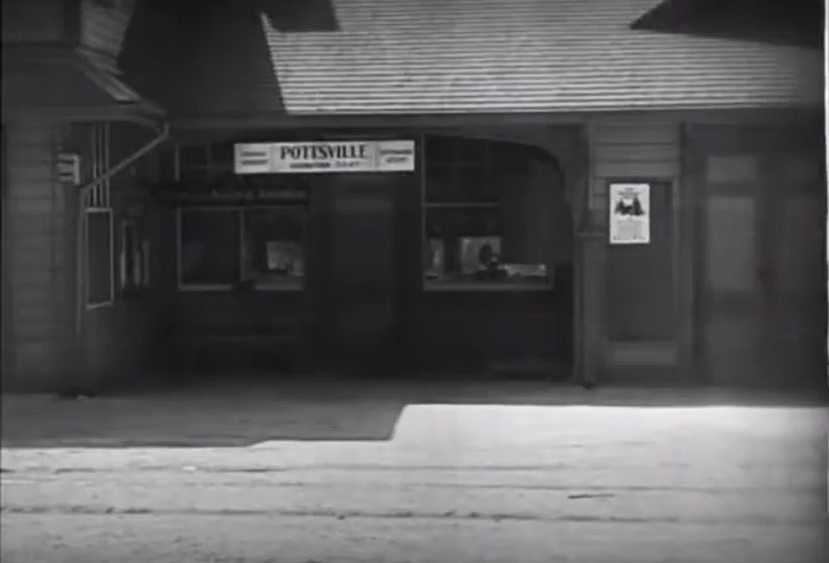 Pottsville! I believe this scene was filmed at a small train station somewhere on the S.P. or P.E. As a steam locomotive flashes by, I can just make out, “SOUTHERN PACIFIC” on the tender.