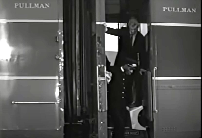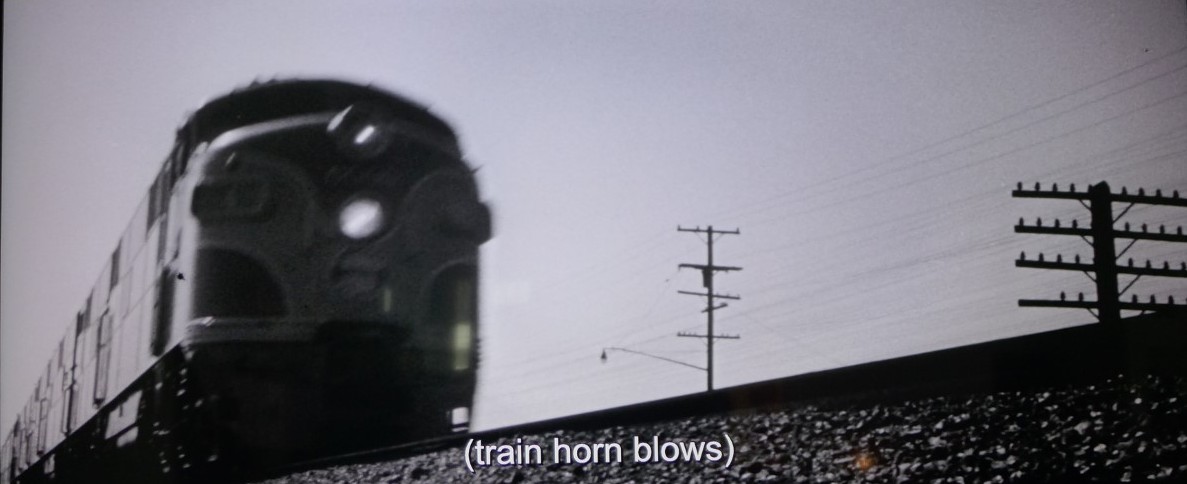 Our train narrative begins at 4:23 minutes into the movie. Establishing shot of an SP passenger train flying past the camera – gyralite spinning. I can just make out the numeral “4” in the locomotive’s number board. That would make this the eastbound SP-Rock Island Golden State train. The locomotives appear to be EMD E7’s painted in a Daylight red-orange paint scheme.