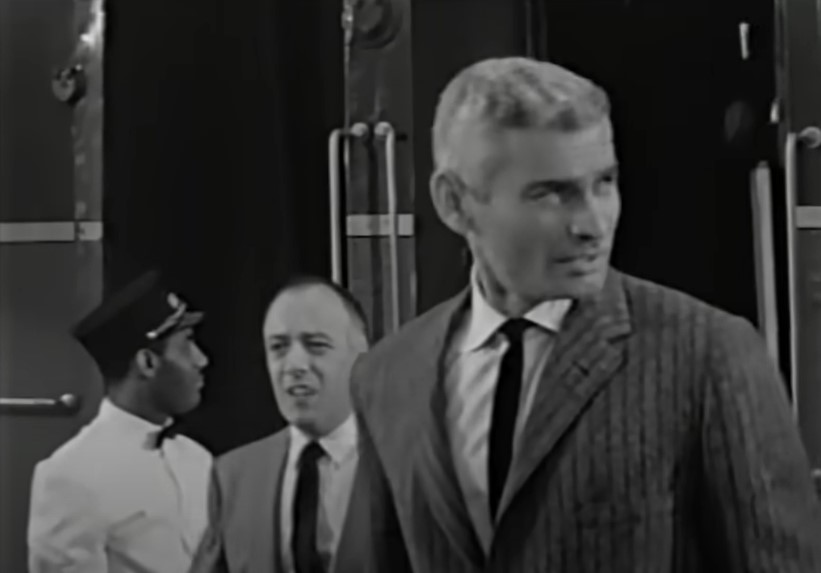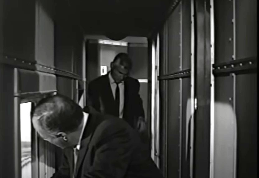 Reporter Ralph Adams (played by Edward Platt) and Jim Blane chat it up over drinks in the observation car. Lawyer Jim is on his way to Desert Valley to defend a client. Ralph is along to keep an eye on him and write a story about the trial.