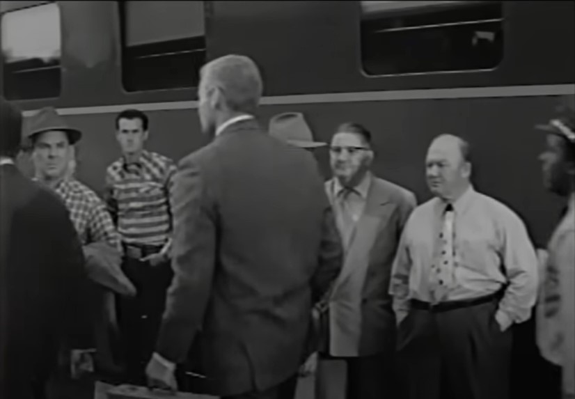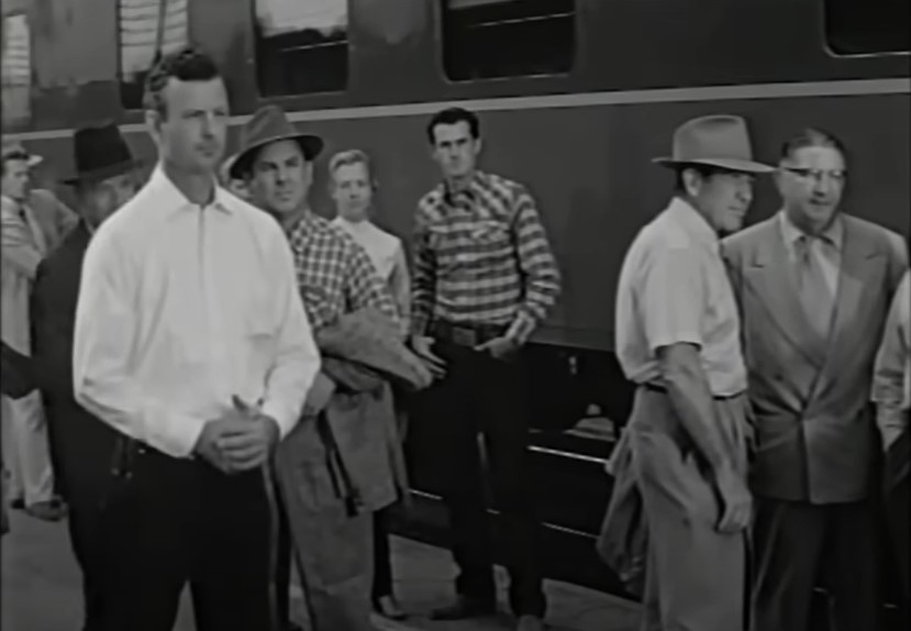 Hotshot New York lawyer Jim Blane (played by Jeff Chandler) has arrived in town to get a local crook off the murder charge. The townsfolk are not pleased. Note the Southern Pacific sleeping car in the background.