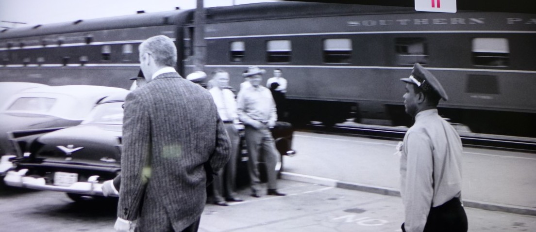 Let’s take a closer look at the last two cars of the train. Notice the black, rectangular patch behind the porter. SP carefully painted over the “LARK” script lettering.