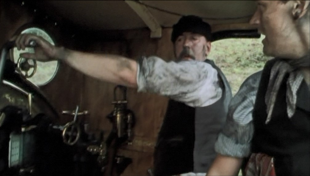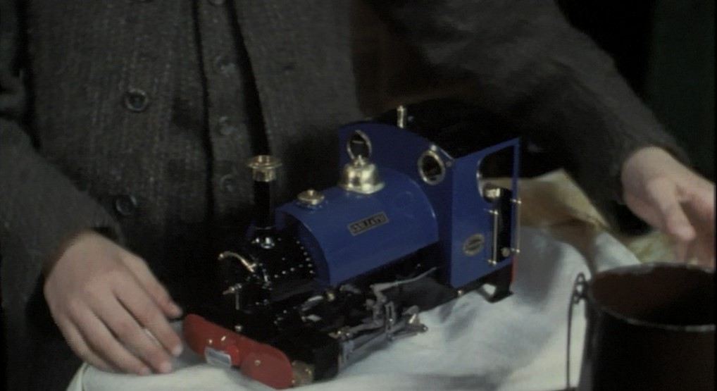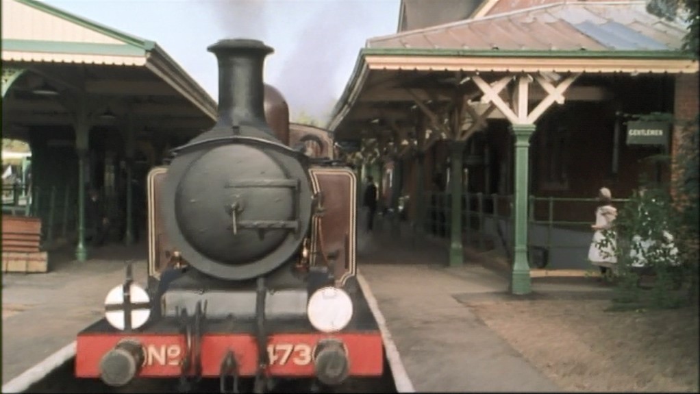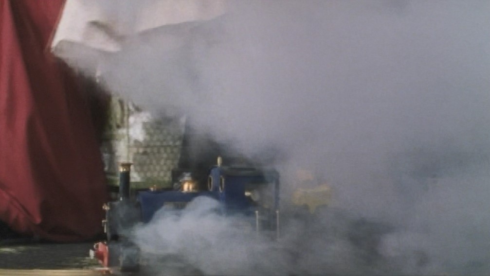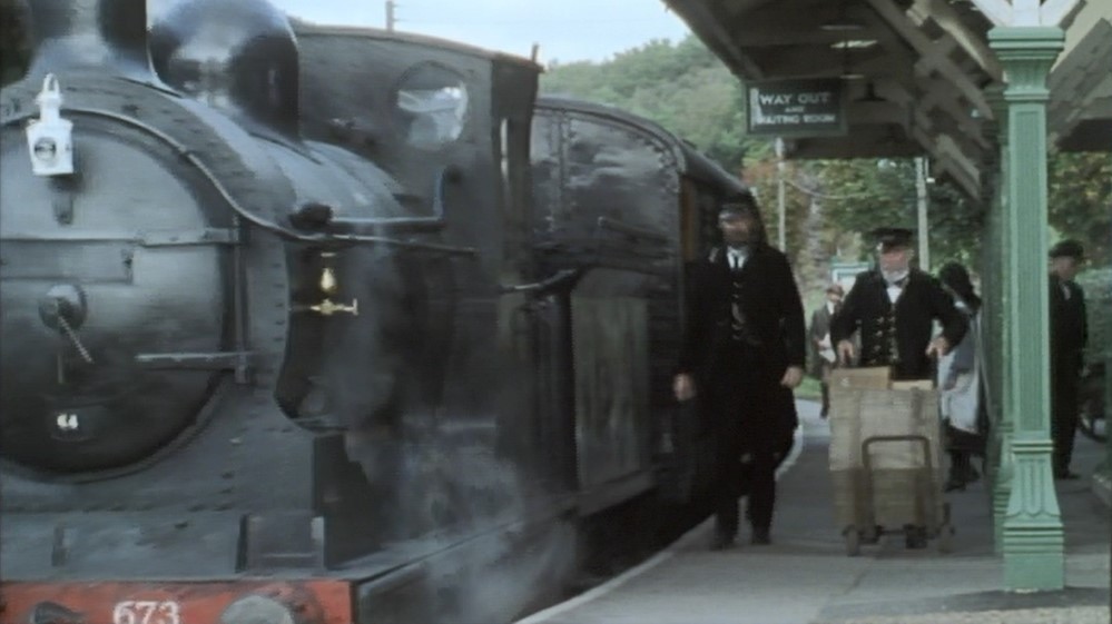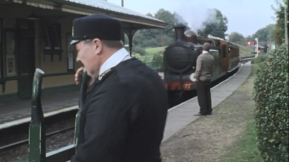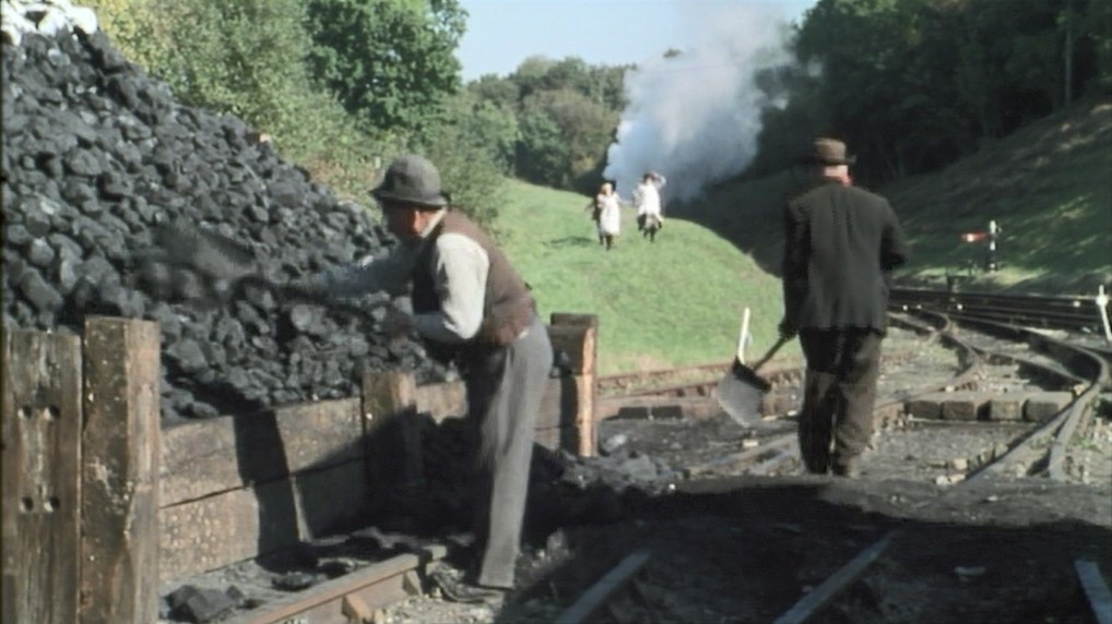 Approaching the depot (note the bunker of coal for the locomotives), the gang crosses the tracks and are chatted up by the friendly porter, Mr. Perks (played by Gregor Fischer). Coming up behind them is the no-nonsense Station Master (played by Clive Russell). Final shot is #673, Maude, pulling a short train.