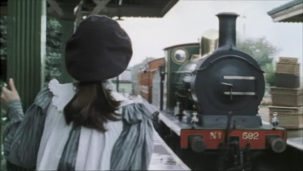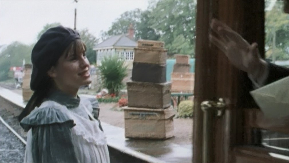 Now under reduced circumstances, the family (sans father) are deposited on the platform at Mortonhurst station (Horsted Keynes).
