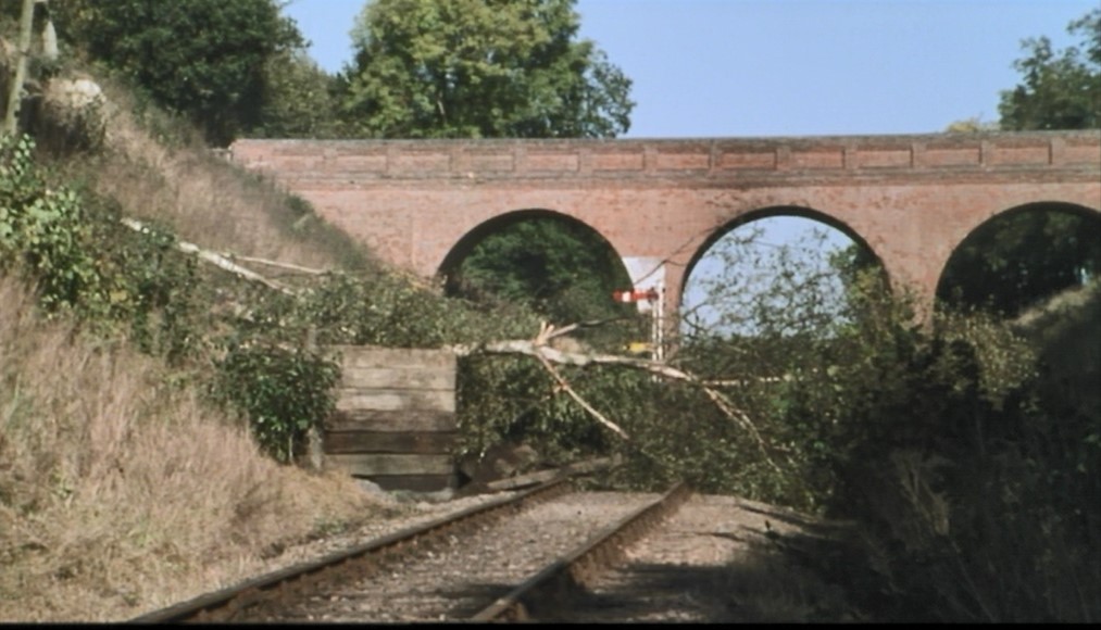 Walking the roadbed, the children witness a landslide which blocks the tracks. Location is the Three-Arch Bridge.