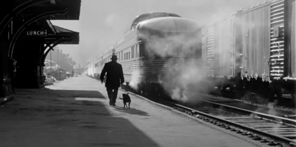 A man and his canine companion walk the platform as #2 departs Revelstoke; Upstairs in the depot, the Dispatcher (DS) Harry Croft consults his timetable to line up a meet at Illecillewaet.