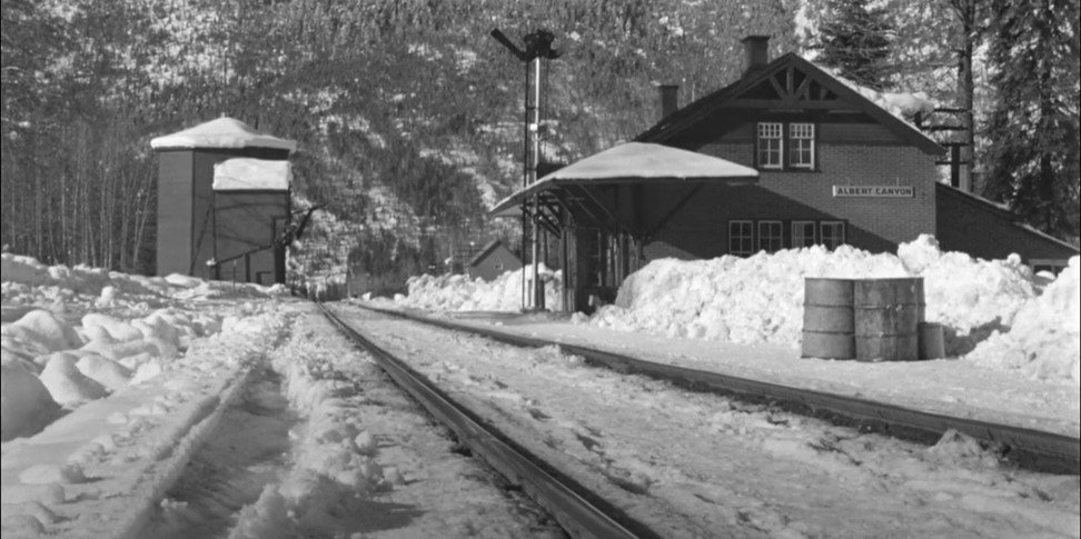 Albert Canyon depot with both station signals set to pick up orders (Copy 19). Note the enclosed water tank down the track. The agent takes down orders from the DS. I like the agent’s sweater!