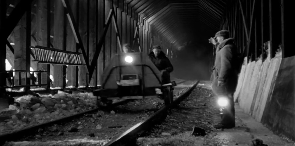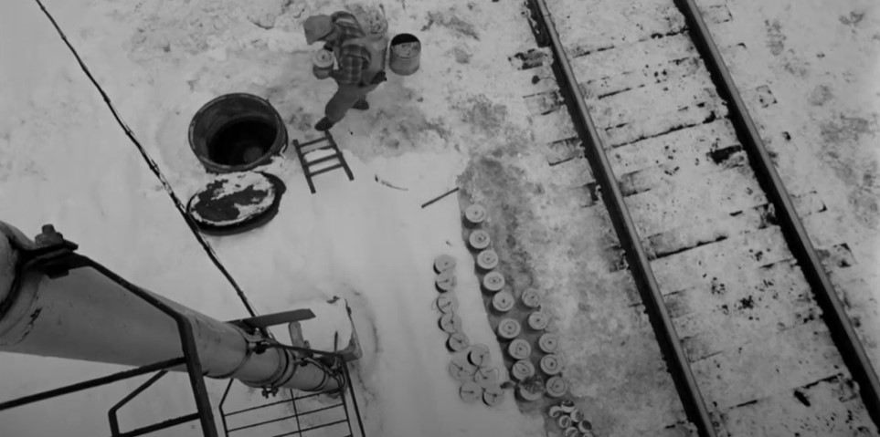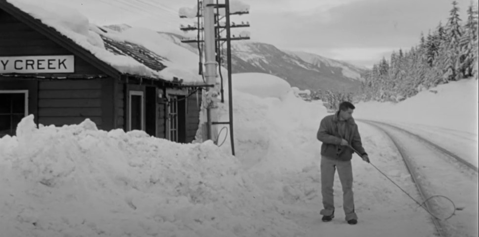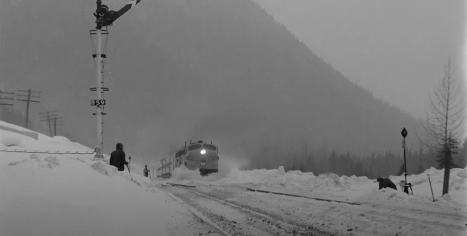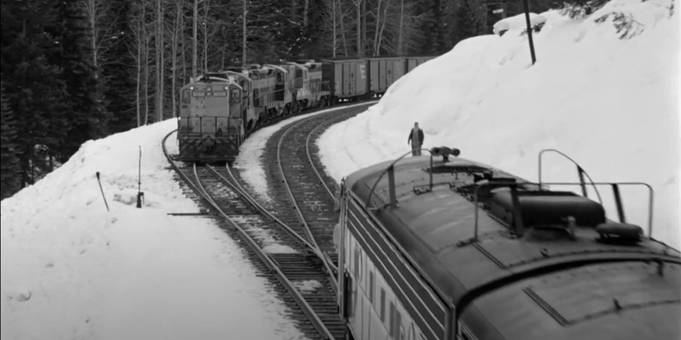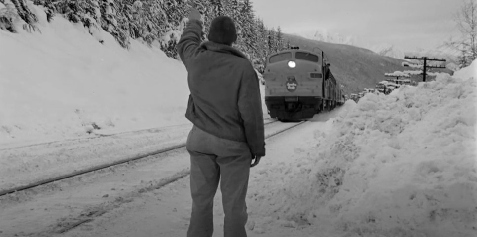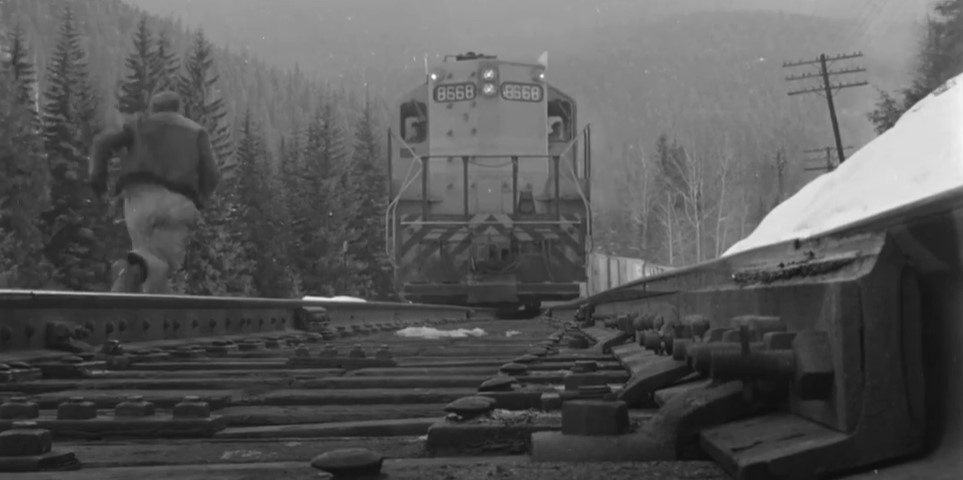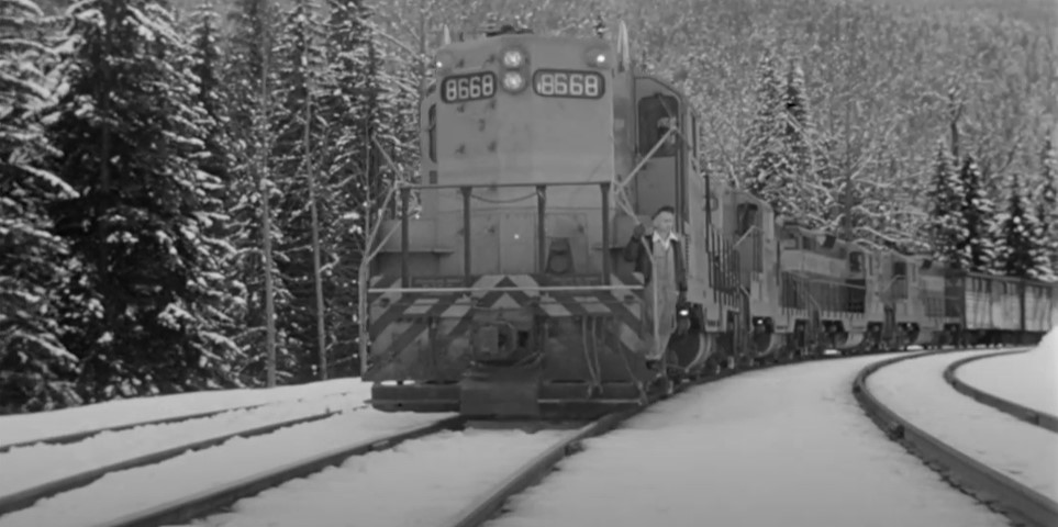 GMD GP9 CPR #8668 (freight train) is in the siding at Illecillewaet. A crewman stands in the snow to give #7 a Engineer’s side roll by inspection.