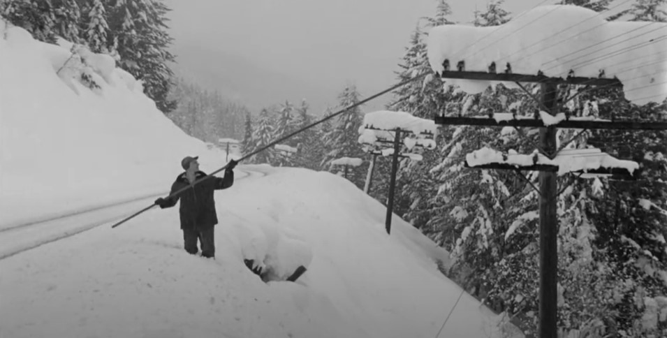Between trains, track workers patrol and use long poles to knock down accumulated snow from signal and communication lines.